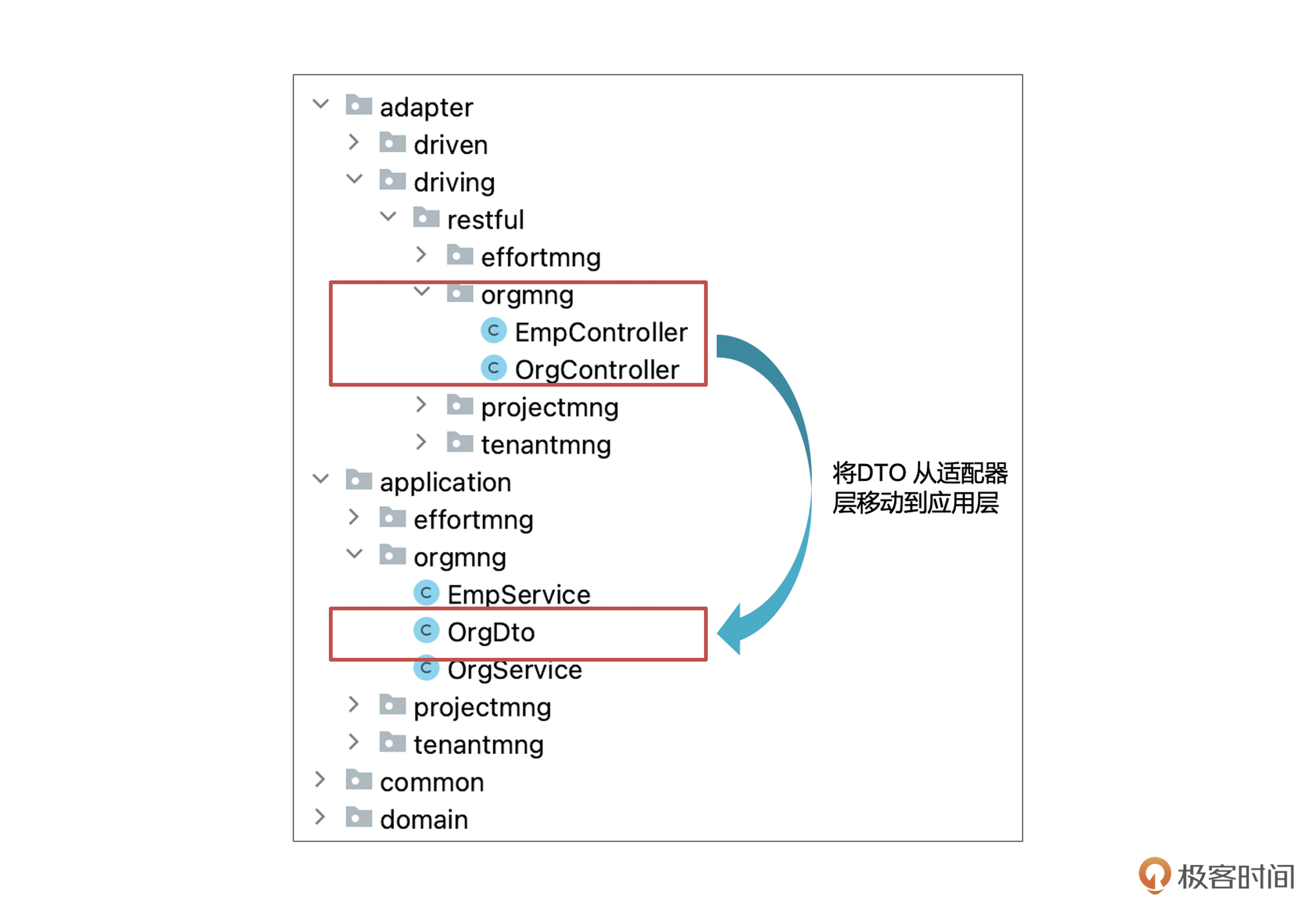 改起来倒是简单,只要把OrgDto移动到应用层就可以了,修改后是后面这样。