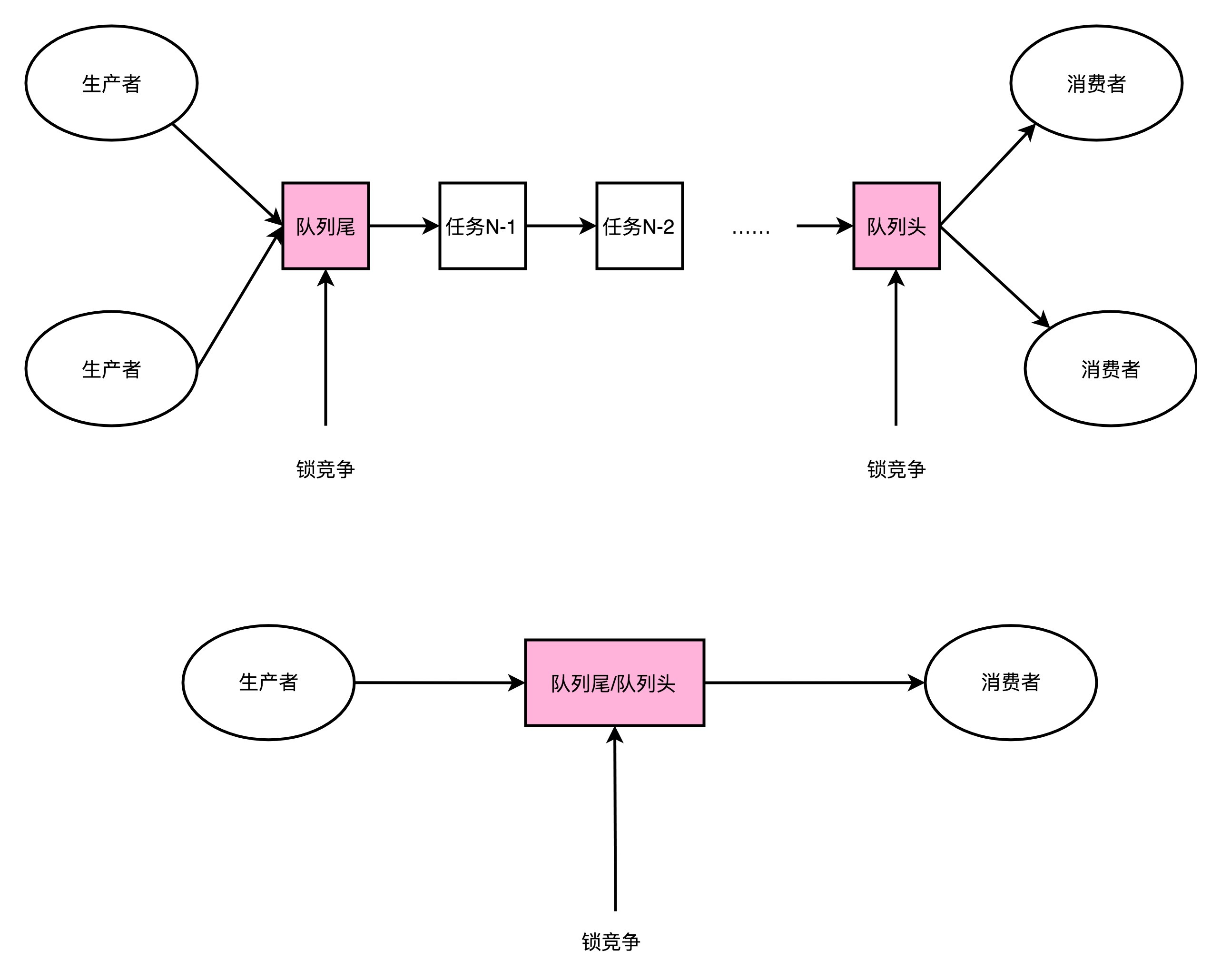 那只有一个生产者,或者一个消费者,我们是不是就没有这个锁竞争的问题了呢?很遗憾,答案还是否定的。一般来说,在生产者-消费者模式下,消费者要比生产者快。不然的话,队列会产生积压,队列里面的任务会越堆越多。