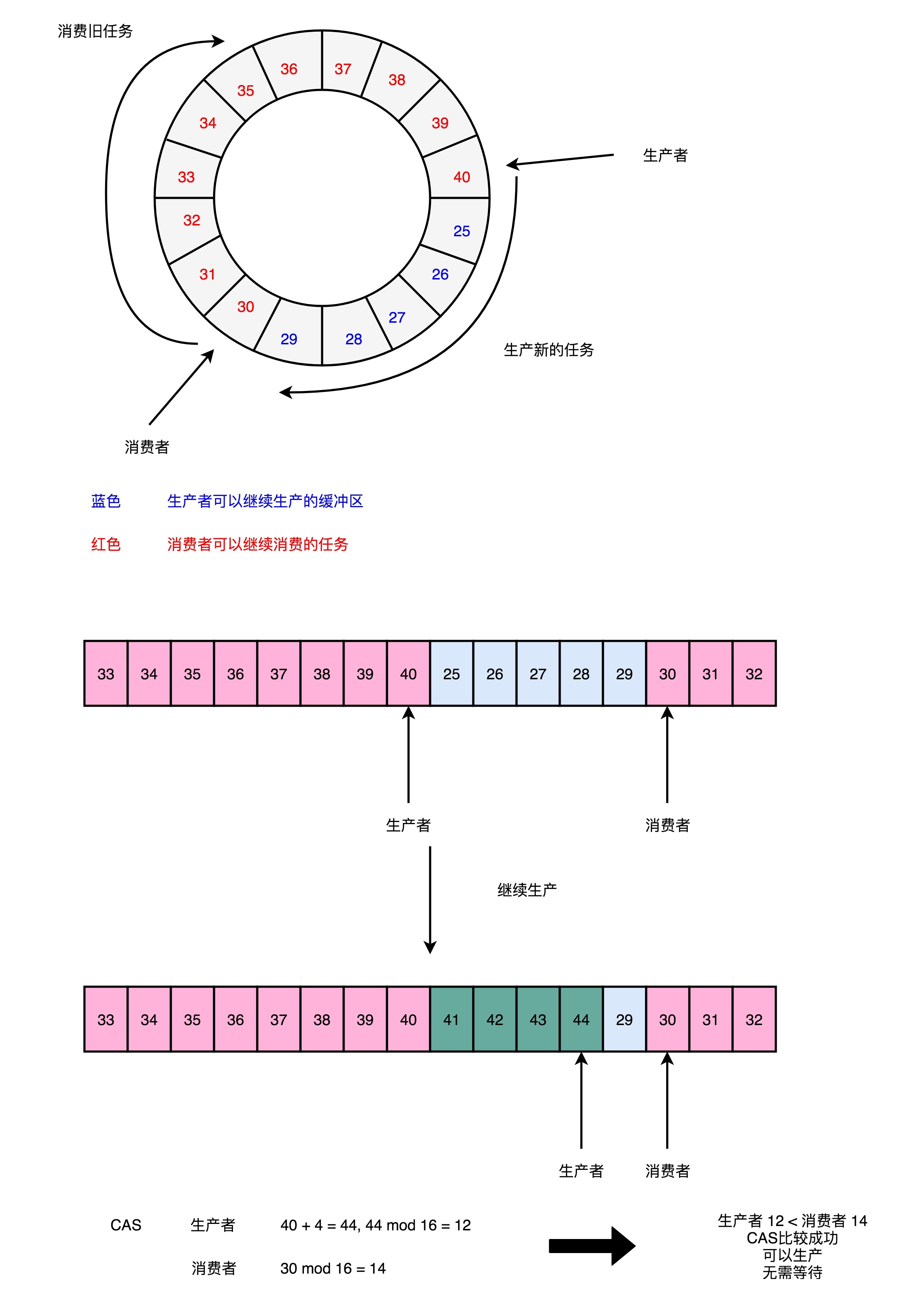 在这个RingBuffer当中,进行生产者和消费者之间的资源协调,采用的是对比序号的方式。当生产者想要往队列里加入新数据的时候,它会把当前的生产者的Sequence的序号,加上需要加入的新数据的数量,然后和实际的消费者所在的位置进行对比,看看队列里是不是有足够的空间加入这些数据,而不会覆盖掉消费者还没有处理完的数据。