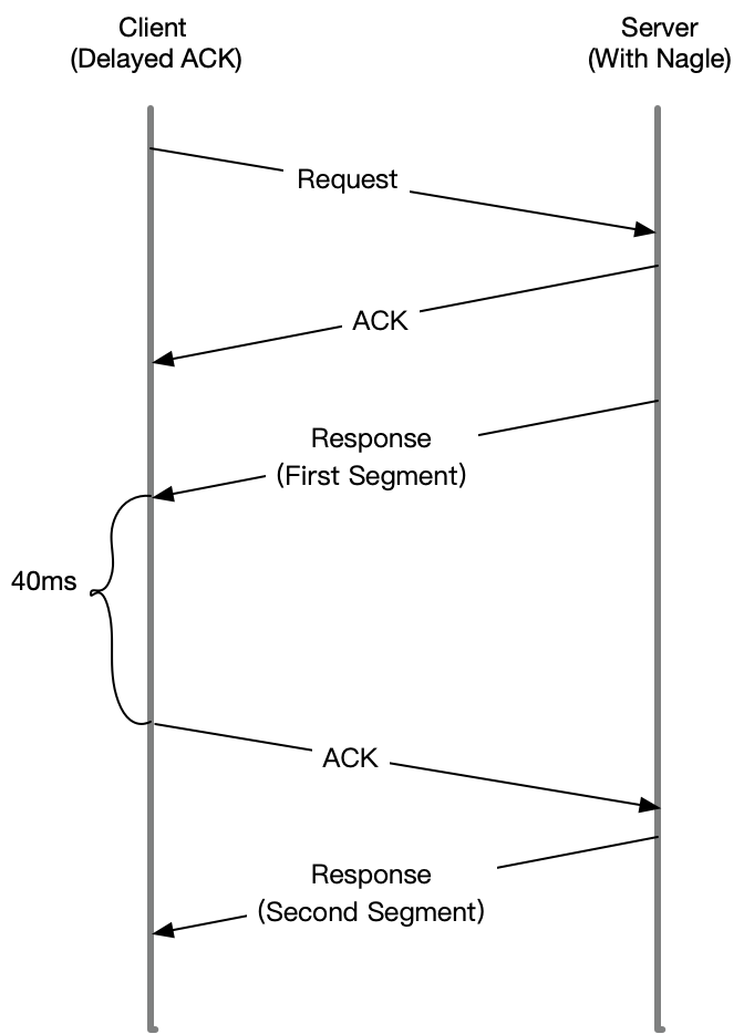 显然,Nagle 算法本身的想法还是挺好的,但是知道 Linux 默认的延迟确认机制后,你应该就不这么想了。因为它们一起使用时,网络延迟会明显。如下图所示: