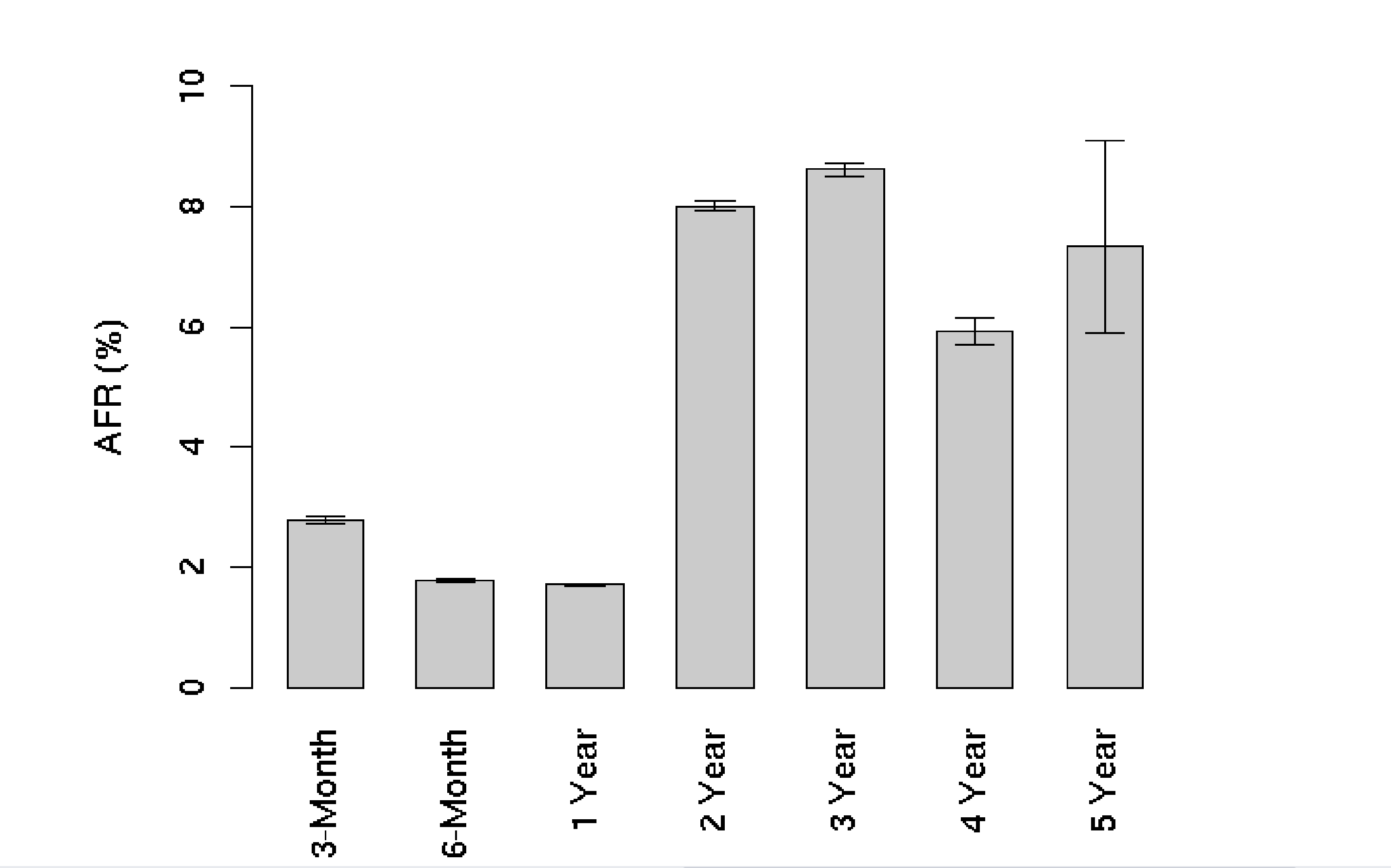可以看到,前三个月会超过2%的磁盘损坏率,到第二年这个数字会上升到8%左右。