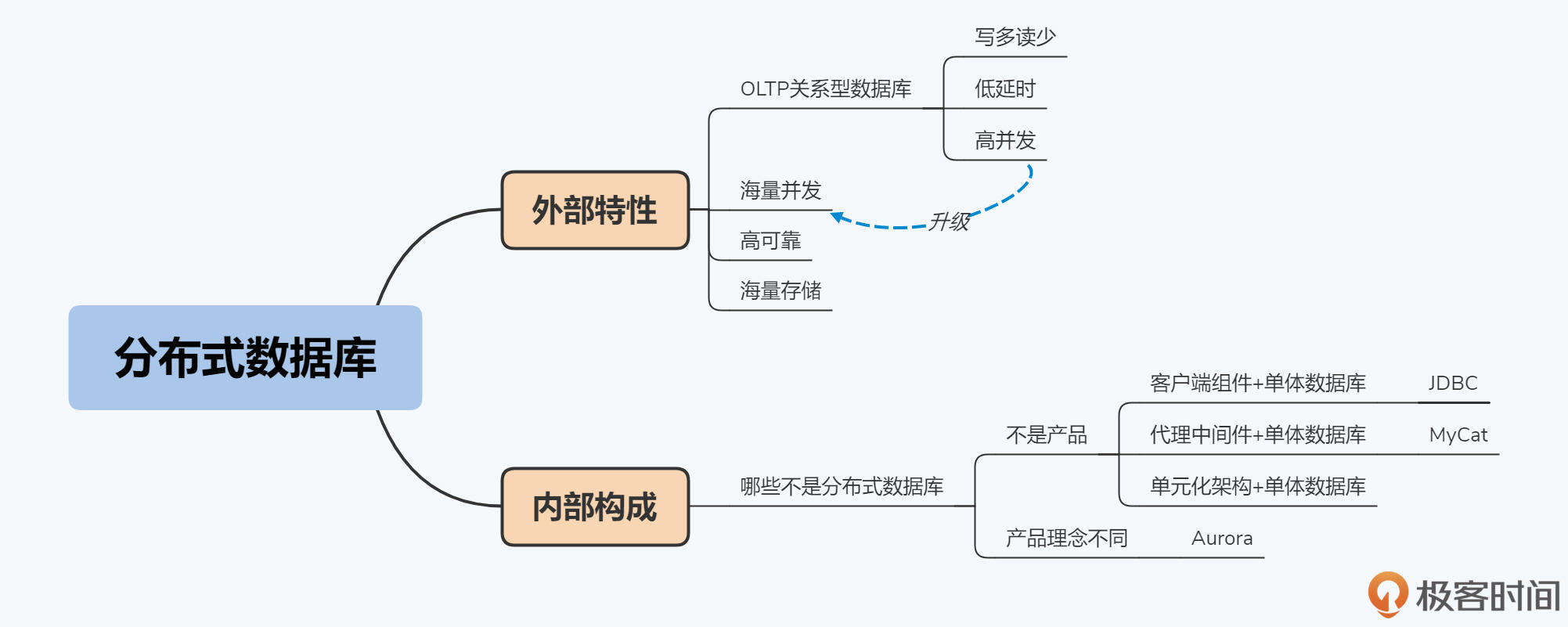 我们通过逐层递进的方式,勾勒出分布式数据库的六个外部特性,分别是写多读少、低延时、海量并发、海量存储、高可靠性、关系型数据库。