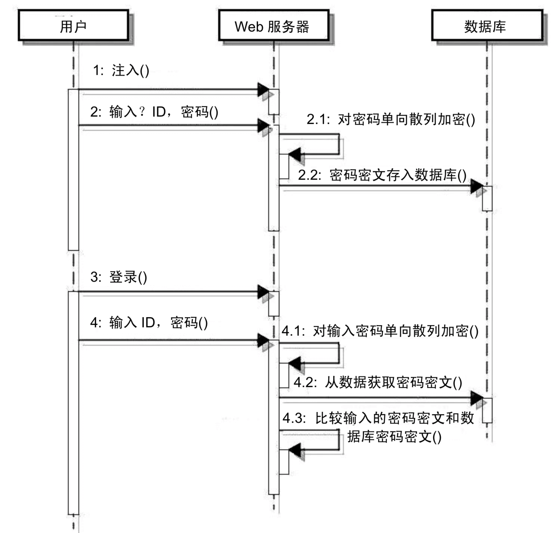 用户在注册的时候需要输入密码,应用服务器得到密码以后,调用单向散列加密算法,对密码进行加密,然后将加密后的密文存储到数据库中去。用户下一次登录的时候,在客户端依然需要输入密码,而用户输入的密码发送到Web服务器以后,Web服务器对输入的密码再进行一次单向散列加密,得到密文,然后和从数据库中取出来的密文进行对比,如果两个密文是相同的,那么用户的登录验证就是成功的。通过这种手段,可以保证用户密码的安全性,即使数据库被黑客拖库,也不会泄漏用户密码。