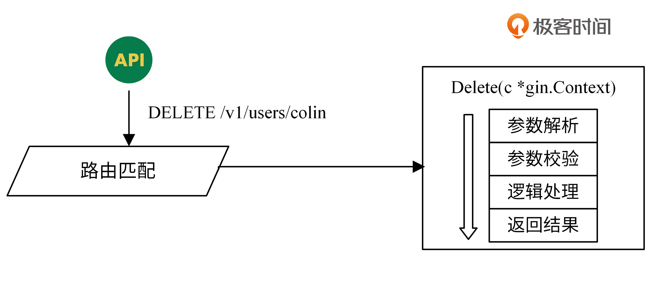 一次HTTP请求经过路由匹配,最终将请求交由Delete(c *gin.Context)函数来处理。变量c中存放了这次请求的参数,在Delete函数中,我们可以进行参数解析、参数校验、逻辑处理,最终返回结果。