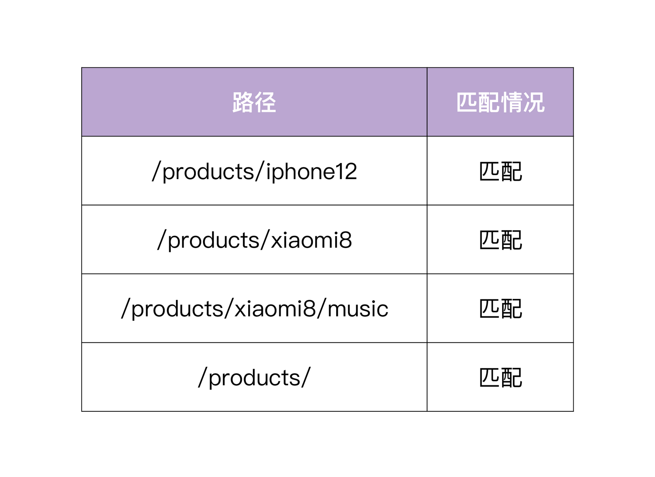 **第一种匹配规则是精确匹配。**例如,路由为/products/:name,匹配情况如下表所示: