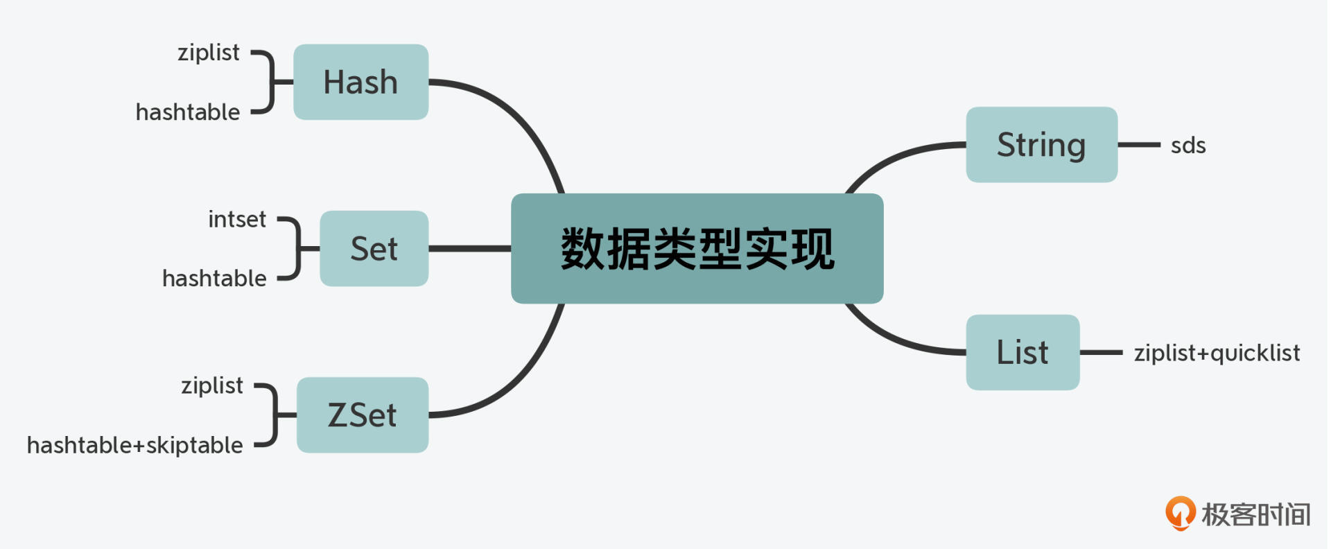 如果你对Redis的数据类型有所了解,就会看到这些数据类型在实现时,底层都对应了不同的数据结构。比如,String的底层是SDS,List的底层是ziplist + quicklist,Hash底层可能是ziplist,也可能是哈希表,等等。