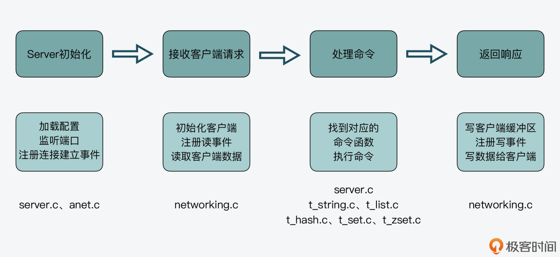 有了这条主线,我们就有了非常明确的目标,而且沿着这条主线去读代码,我们还可以很清晰地把多个模块串联起来。比如从前面的例子中,我们会看到一条命令的执行,主要包含了这样几个阶段。