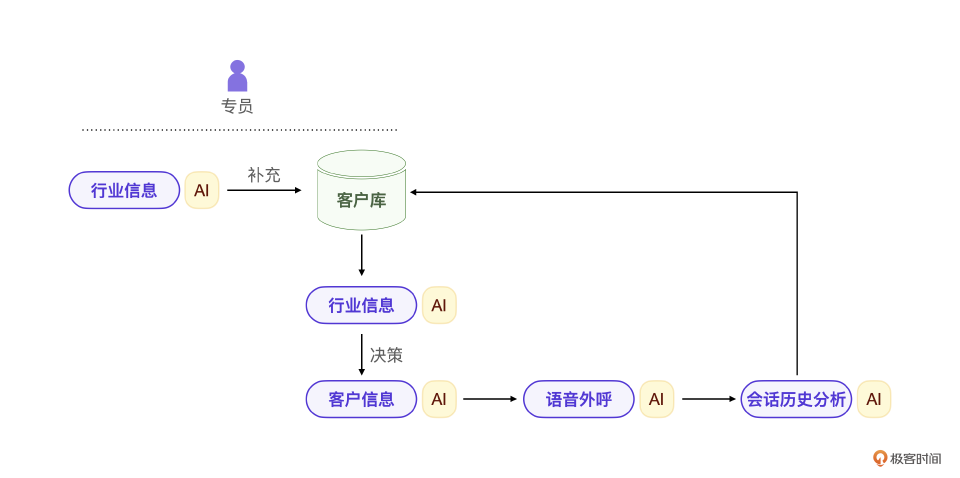 通过我们团队AI化改造之后的外呼营销是什么流程呢?行业信息可以由AI整理,AI还可以分析客户,完成语音外呼,分析会话历史。