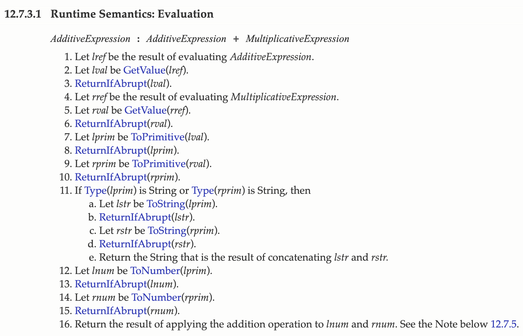 V8会严格根据ECMAScript规范来执行操作。ECMAScript是一个语言标准,JavaScript就是ECMAScript的一个实现,比如在ECMAScript就定义了怎么执行加法操作,如下所示:
