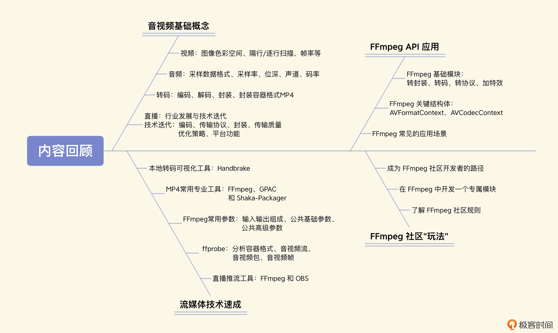 从第一节课到现在,我已经尽我所能地将音视频技术相关的重要知识提炼出来,讲给你听了。从音视频相关的基础知识,到OBS、Handbrake等好用的音视频处理工具,再到FFmpeg命令行参数和API的应用,希望你能跟在我身后打开一扇又一扇音视频技术的大门。
