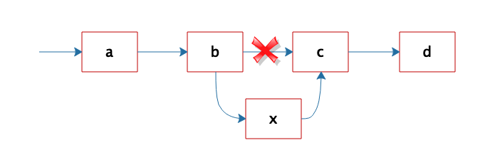 但是正因为链表是不连续存储的,所以在链表中插入或者删除一个数据是非常容易的,只要找到要插入(删除)的位置,修改链表指针就可以了。如图,想在b和c之间插入一个元素x,只需要将b指向c的指针修改为指向x,然后将x的指针指向c就可以了。