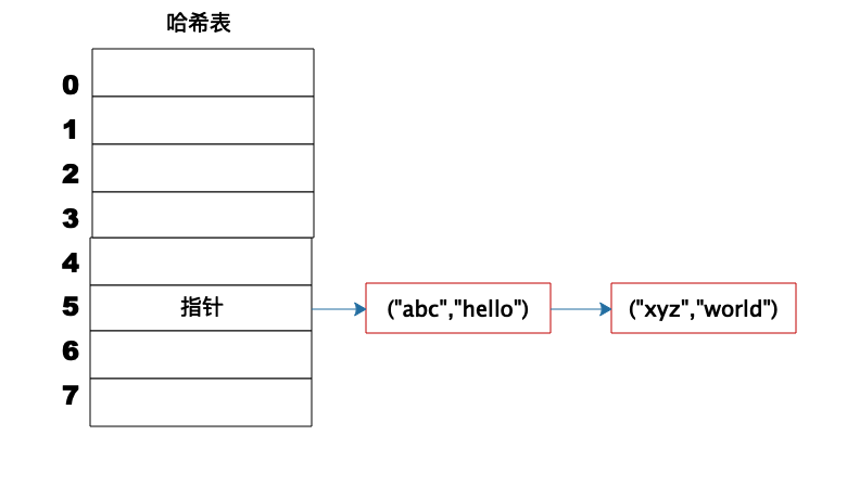 事实上,(“abc”,“hello”)这样的Key、Value数据并不会直接存储在Hash表的数组中,因为数组要求存储固定数据类型,主要目的是每个数组元素中要存放固定长度的数据。所以,数组中存储的是Key、Value数据元素的地址指针。一旦发生Hash冲突,只需要将相同下标,不同Key的数据元素添加到这个链表就可以了。查找的时候再遍历这个链表,匹配正确的Key。