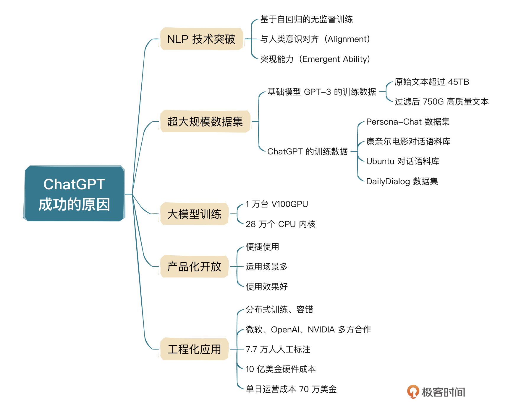 这节课我从宏观方面向你介绍了ChatGPT崛起的原因,相信你也对ChatGPT有了更深入的理解。下面我们再简单总结一下。所谓工程化主要就是指集技术、数据、产品、资源于一身,是一个系统性、规范性的工程项目,很多人想到ChatGPT,就想到了大模型本身,其实这是片面的,具体你可以参考下面思维导图再回顾一下细节。