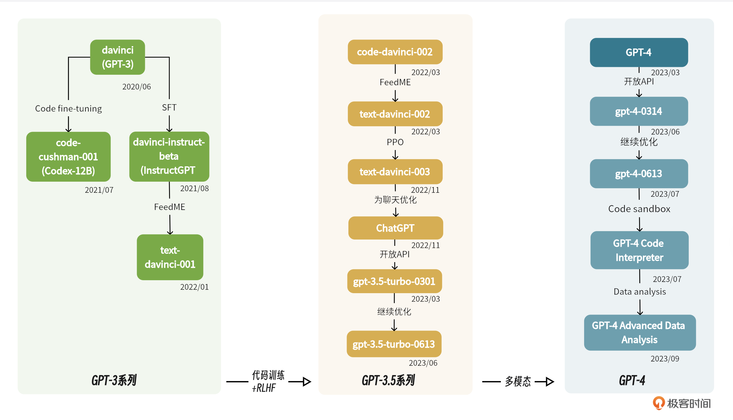 GPT-3和GPT-3.5其实是两个不同的系列,使用过OpenAI API的人应该知道,还有几个细化的模型,比如code-davinci、text-davince系列。顾名思义,code-davince就是OpenAI另一个产品codex使用的模型,在text-davince-001的基础上使用源代码进行训练,产生了code-davinci-002模型(codex)。再后来在code-davinci-002模型基础上,基于有监督的指令微调,产生了text-davinci-002,最后在text-davinci-002模型基础上,使用RLHF,产生了text-davinci-003和ChatGPT模型。演进过程如图所示: