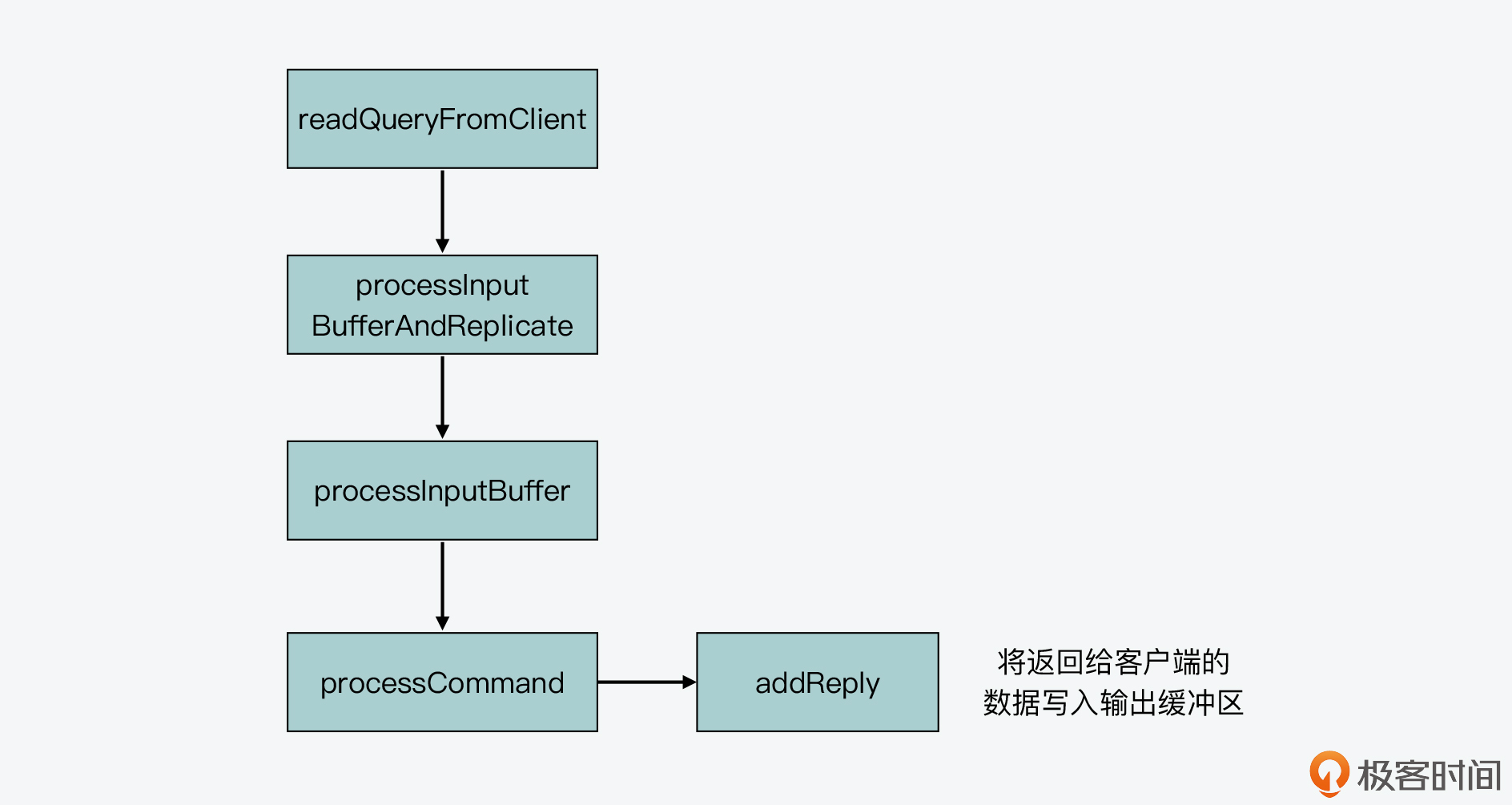 紧接着在上节课,我带你学习了Redis事件驱动框架的基本工作机制,其中介绍了事件驱动框架基于的Reactor模型,并以IO事件中的客户端连接事件为例,给你介绍了框架运行的基本流程:从server初始化时调用aeCreateFileEvent函数注册监听事件,到server初始化完成后调用aeMain函数,而aeMain函数循环执行aeProceeEvent函数,来捕获和处理客户端请求触发的事件。