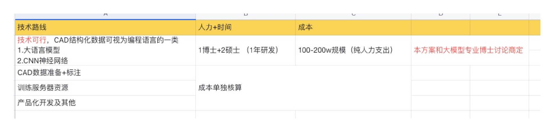 每张CAD图的数据量有100M,这导致GPU算力的需求也显著增加,全量训练一次可能需要数百万的投资。同时,团队中必须有具备创新能力的博士,以应对行业前沿问题,特别是大模型行领域新技术层出不穷,需要有人能看懂和复现最新的论文成果。