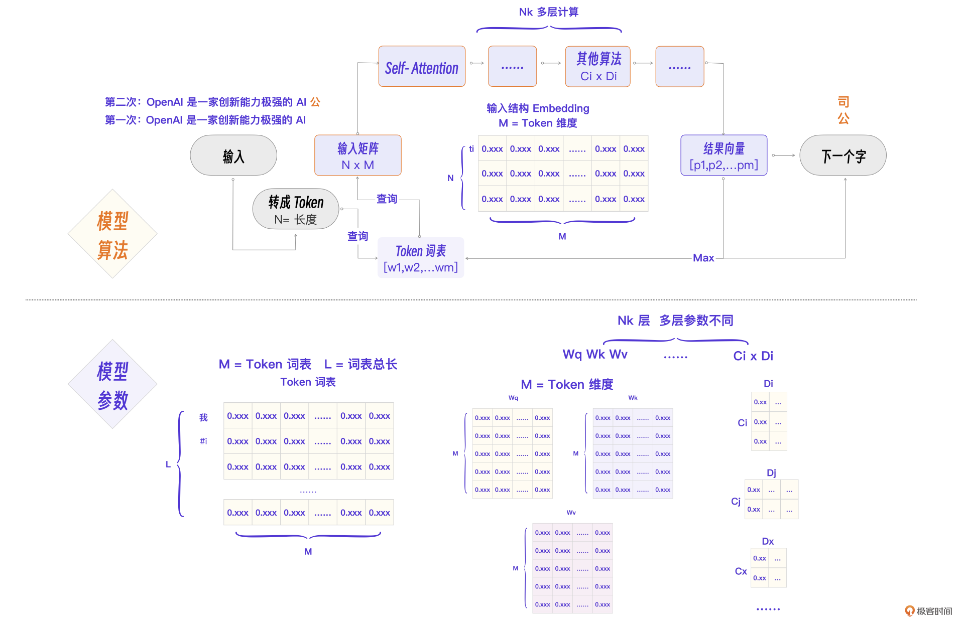 在说这个问题之前,不妨回顾一下大模型的基本原理,你可以回想一下GPT的1750亿参数到底是什么含义。我先把大模型的基本流程图放到下面。
