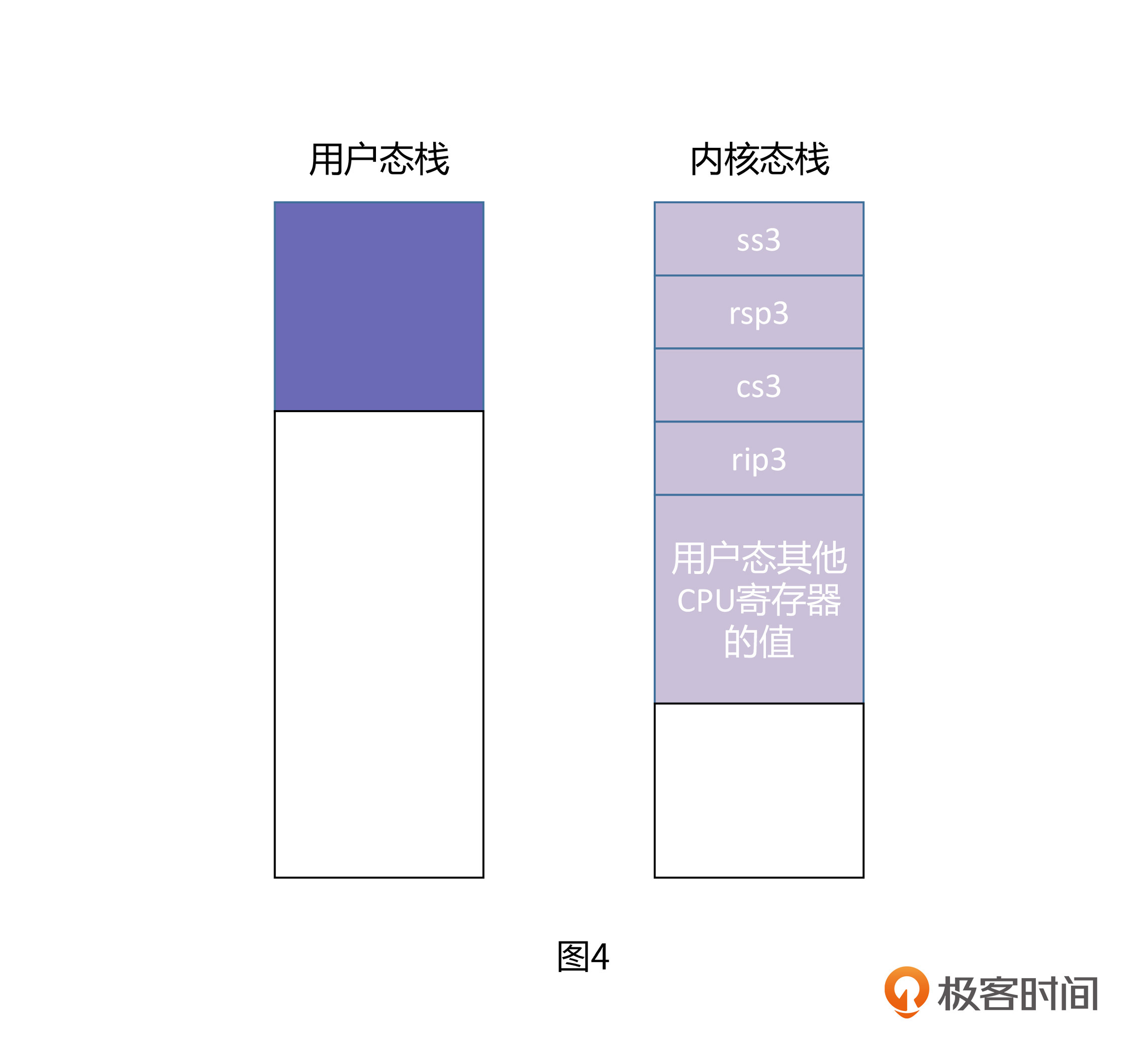 一般来说,当程序因为call指令或者int指令进行跳转的时候,只需要把下一条指令的地址放到栈上,供被调用者执行ret指令使用,这样可以便于返回到调用函数中继续执行。但图4中的内核态栈里有一点特殊之处,就是CPU自动地将用户态栈的段选择子ss3,和栈顶指针rsp3都放到内核态栈里了。这里的数字3代表了CPU特权级,内核态是0,用户态是3。