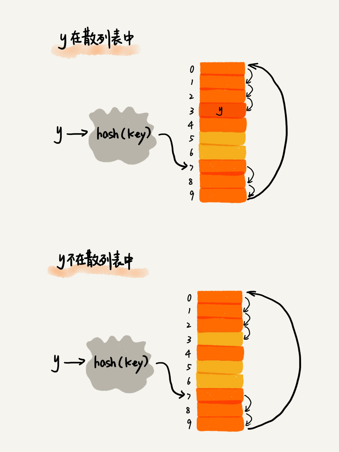 从图中可以看出,散列表的大小为10,在元素x插入散列表之前,已经6个元素插入到散列表中。x经过Hash算法之后,被散列到位置下标为7的位置,但是这个位置已经有数据了,所以就产生了冲突。于是我们就顺序地往后一个一个找,看有没有空闲的位置,遍历到尾部都没有找到空闲的位置,于是我们再从表头开始找,直到找到空闲位置2,于是将其插入到这个位置。