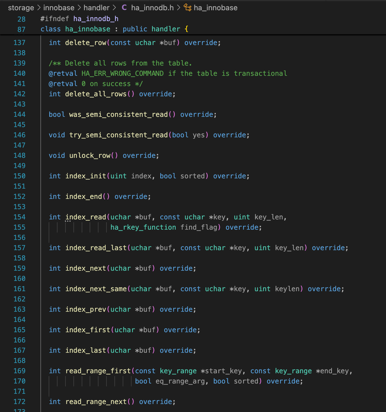 - sql/handler.cc里实现了handler类。读取或修改表里的数据,都会通过handler接口来实现。存储引擎继承handler类(比如innodb的ha_innobase),实现数据的读写功能。