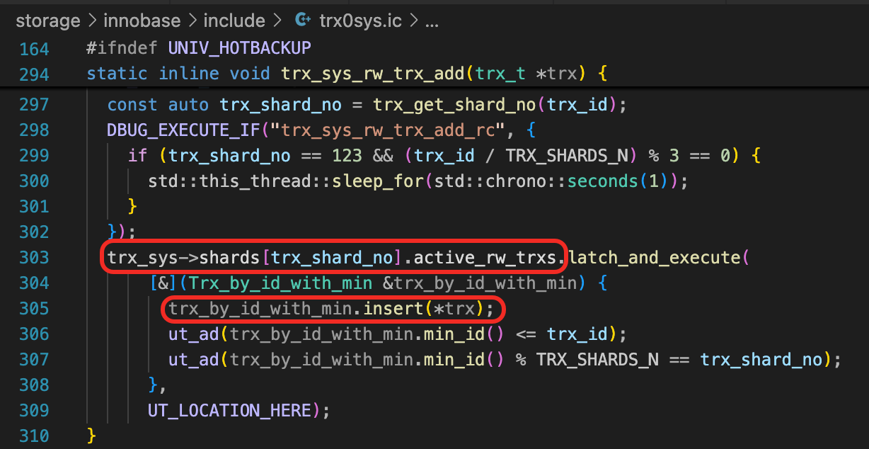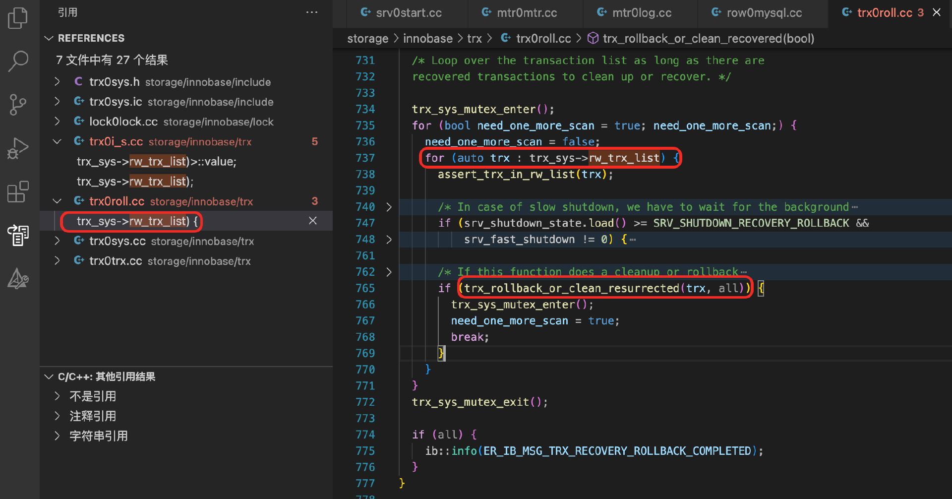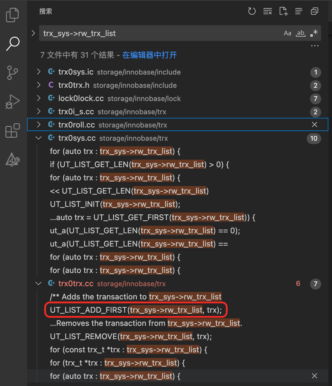 那么数据库启动时,rw_trx_list里的数据是从哪里来的呢?使用查找功能(CMD + SHIFT + F)进行搜索,发现trx0trx.cc中有一处代码会往这个列表中插入数据(UT_LIST_ADD_FIRST)。
