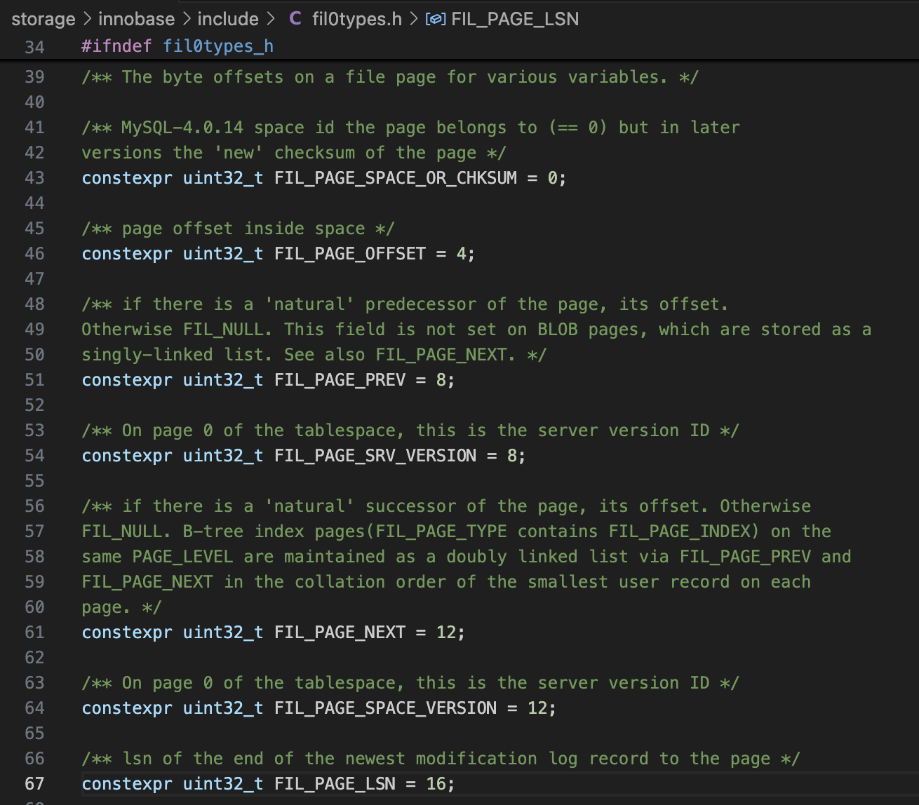 fil0types.h中定义了InnoDB页面的基本格式,这里定义了页面头部和尾部中各个字段在页面内的偏移地址。
