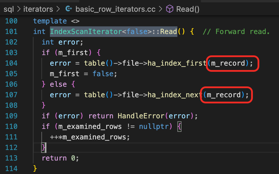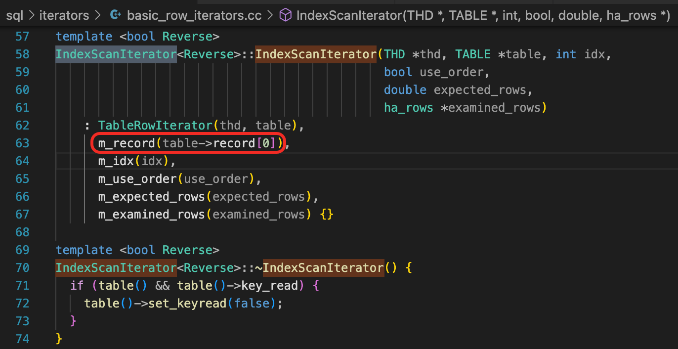 这个m_record又是从哪里来的呢?这是IndexScanIterator类的一个成员,在构造函数中初始化成table->record[0]。