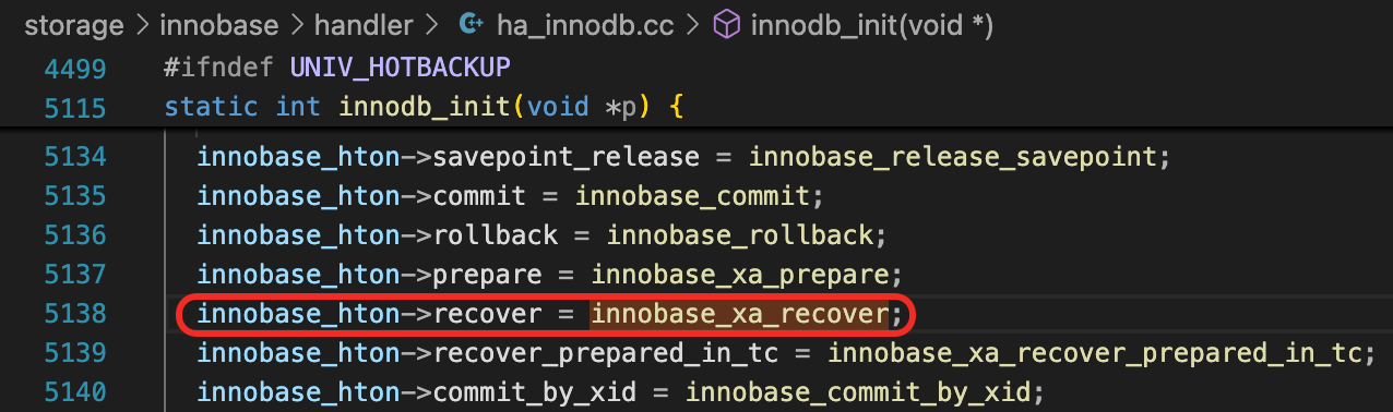 谁调用了innobase_xa_recover呢?你会发现代码中并没有直接调用这个函数。但是innodb_init中,这个函数赋值给了innobase_hton->recover这个函数指针。执行innobase_hton->recover时,实际上就是在执行innobase_xa_recover。