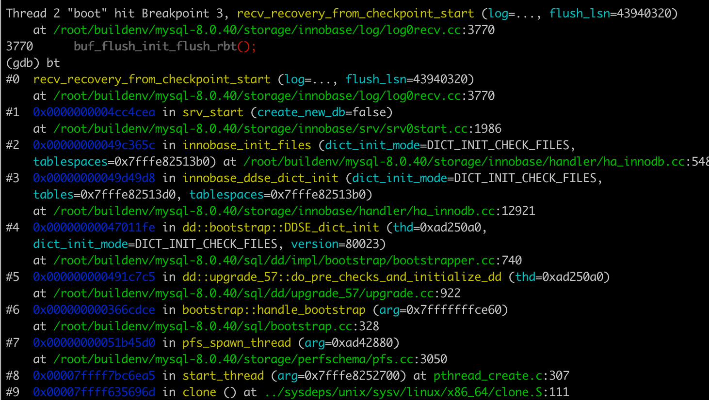 你会发现接下来先运行到trx_sys_init_at_db_start处的断点,然后再运行到open_binlog。在一些关键的代码点上设置断点,可以观察到一些代码的运行顺序。比如数据库启动时,先执行Redo,再执行Undo。