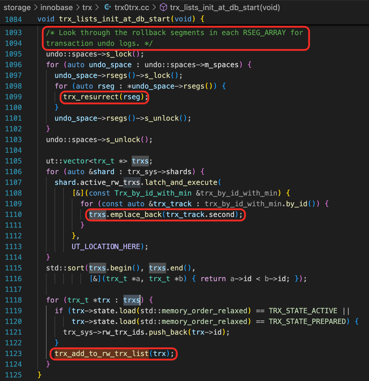 - 扫描每一个Undo表空间中的每一个回滚段,调用trx_resurrect函数,读取回滚段中所有的Undo段,把未完成的事务识别出来。trx_resurrect函数中最终会调用trx_sys_rw_trx_add,把事务加到trx_sys->shars中。