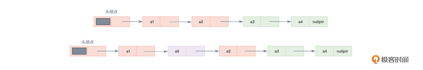 单看上面这段话有些绕,我们看一下把元素a5插入到单链表第2个位置前后对比图,会更好理解。