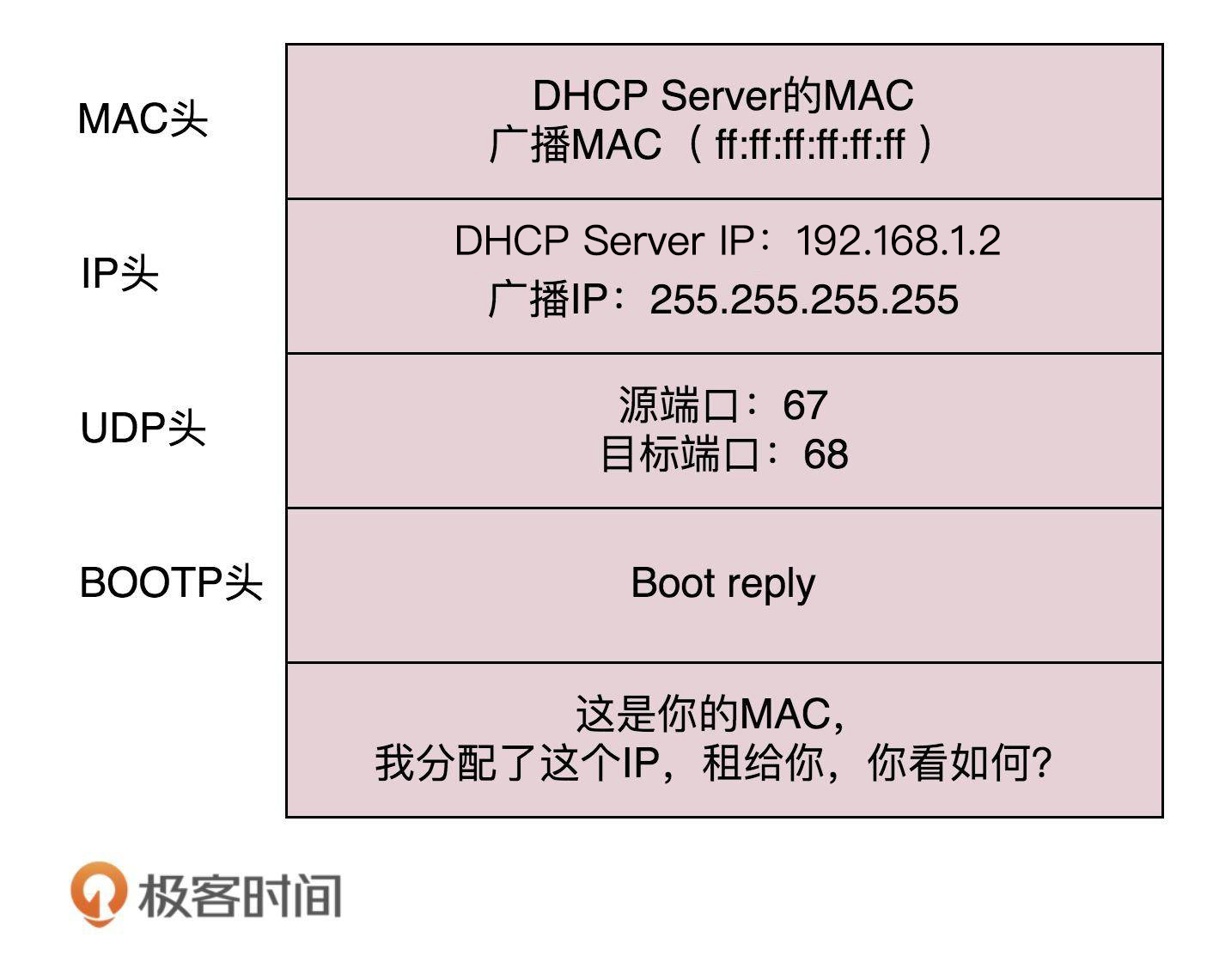 新来的机器使用IP地址0.0.0.0发送了一个广播包,目的IP地址为255.255.255.255。广播包封装了UDP,UDP封装了BOOTP。其实DHCP是BOOTP的增强版,但是如果你去抓包的话,很可能看到的名称还是BOOTP协议。