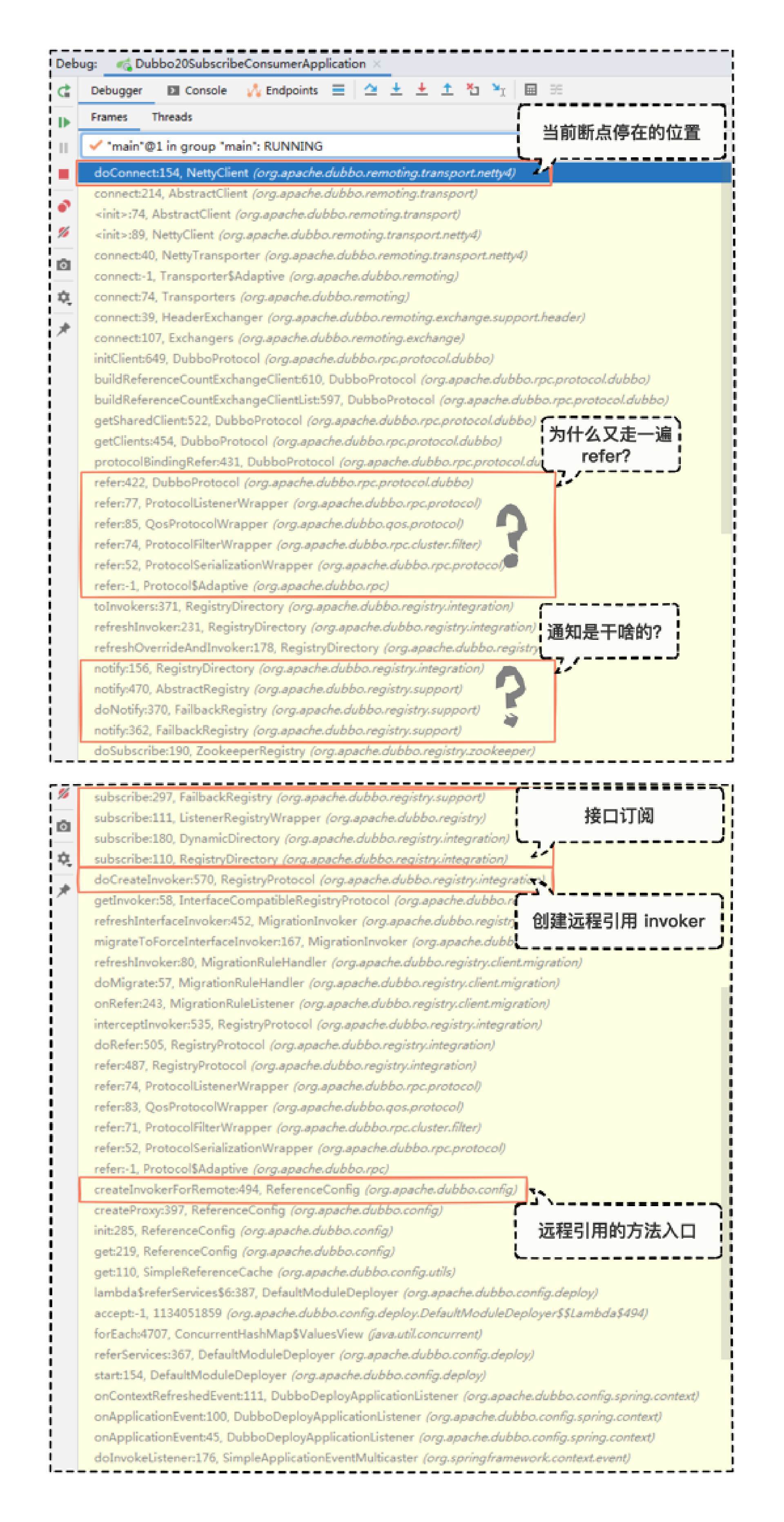 首先是熟悉的方法名,为远程引用创建 invoker 的方法入口 createInvokerForRemote。 RegistryProtocol 中创建 invoker 的核心方法 doCreateInvoker。 还未来得及进入源码一探究竟的 subscribe 接口订阅方法。 接口订阅之后来了一堆的 notify 的通知方法,并且又再次走了一遍 refer 方法,很是奇怪。 最后是NettyClient 的 doConnect 方法。 到这里,我们通过 NettyServer 推测出了 NettyClient 是成立的,推测一完全正确。