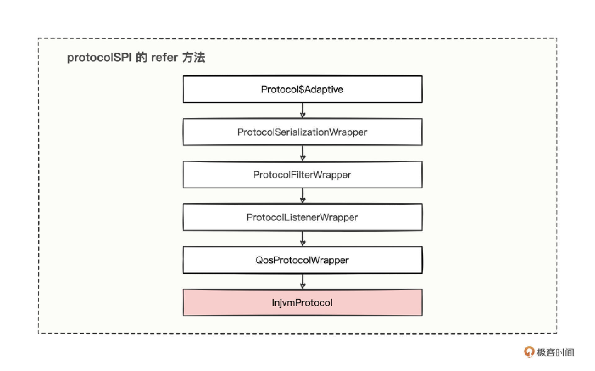 先经过了一系列的包装类,然后进入到 InjvmProtocol 实现类中。和导出时通过 injvm 走的流程,其实是一样的,再次证明了 export 和 refer 是成对存在的。