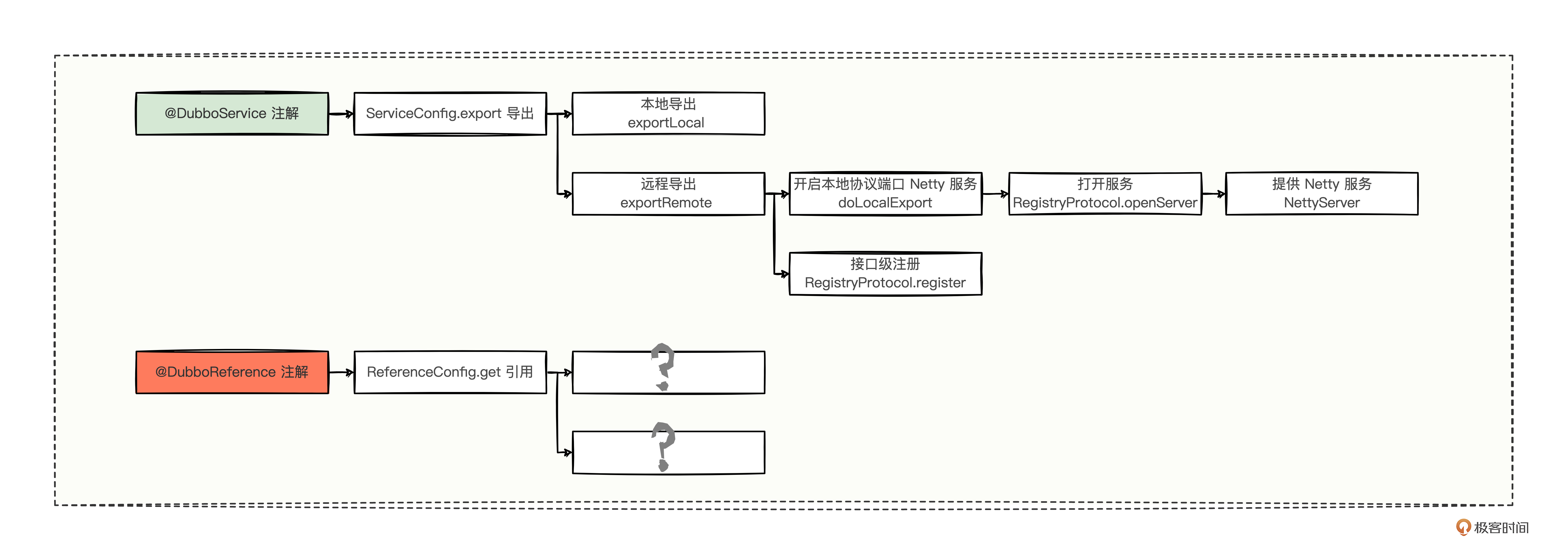 作用域,@DubboService 是作用于提供方的,而 @DubboReference 是作用于消费方的; 类的名称,@DubboService 会落到 ServiceConfig 中进行导出,而 @DubboReference 会落到 ReferenceConfig 中进行引用; 辐射功能,ServiceConfig 中涵盖了本地导出和远程导出两个重要的分支逻辑,但是 ReferenceConfig 还暂时不清楚。 有没有发现,这些小知识点你都学过。学知识,越比较,越能发现问题,然后在逐步解答问题的过程中,你会发现各个知识点已经融入了你的知识体系中。