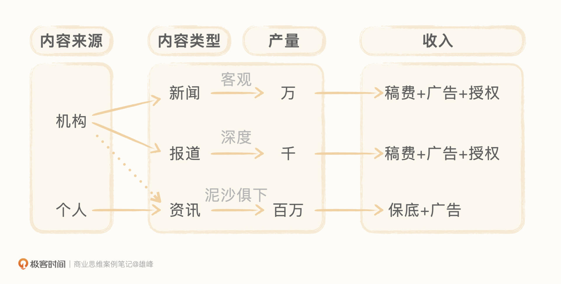 在内容行业中,内容的生产者大致可分为两类:机构和个人。内容的类型可分为三类:新闻、报道以及资讯。机构生产的主要是新闻+报道,少部分是资讯,个人(自媒体)生产的主要是资讯。
