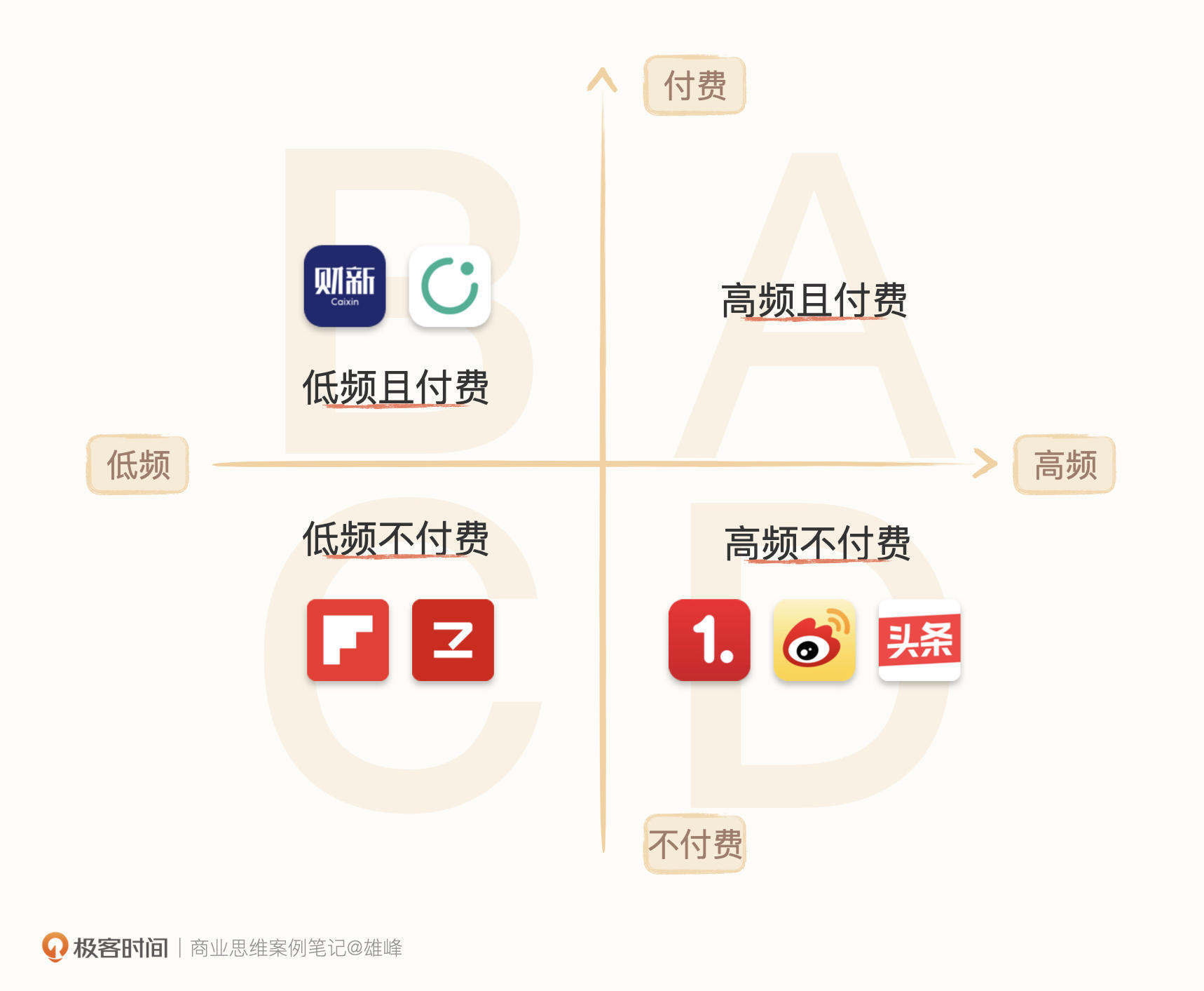 **丙:**20%用户的80%需求,**小众用户的刚性需求。**小众用户对内容则是投资的态度,因此会更偏向深度、严肃等高质量内容。比如财新、知识星球、Flipboard或者极客时间。