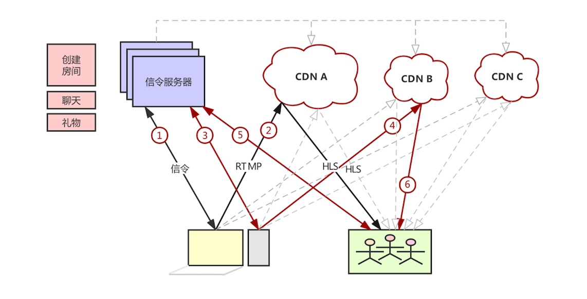 比如,当某个主播要分享一个节目时,信令服务器首先根据分配比例决定使用哪个CDN网络,然后获得该CDN网络的API操作地址。获取到 CDN 网络的API操作地址后,它就可以调用该CDN网络提供的 HTTP/HTTPS API 进行操作了,创建域名、生成直播地址、生成拉流地址等等。有了这些地址后,就可以将音视频流推送到CDN网络,观众端获取到观看地址后就可以“观看”节目了。