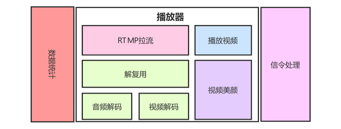 介绍完主播端的功能后,接下来我们再来看看观众端(如下图)。观众端与主播端是很类似的,但实际上我们自己并不会将每个模块都亲手实现,因为对于观众端来说,大部分模块都属于播放器的功能。因此,我们在实现观众端的时候,只需要实现信令处理模块、数据统计模块,并将播放器集成进来就可以了。