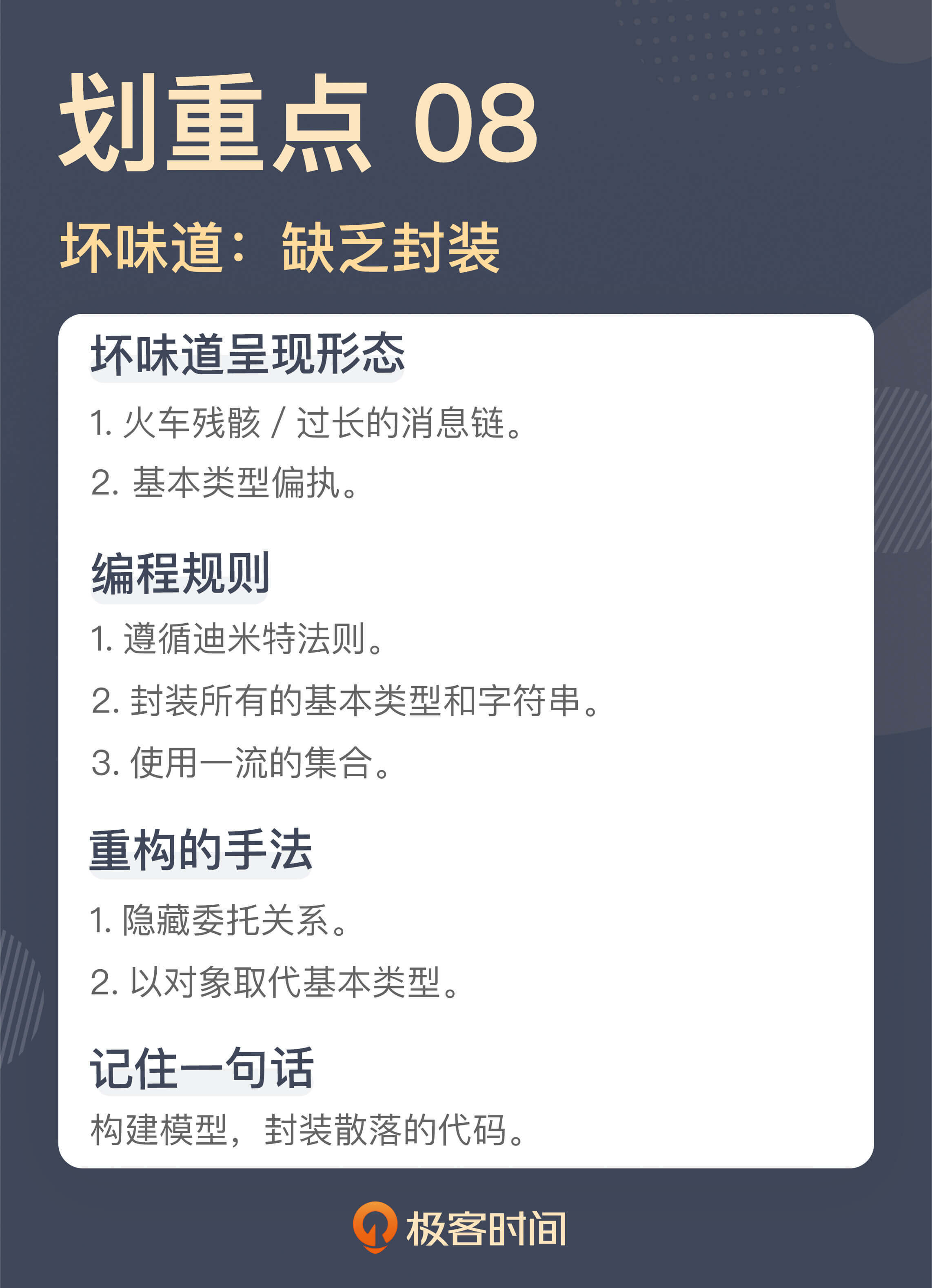 火车残骸的代码就是连续的函数调用,它反映的问题就是把实现细节暴露了出去,缺乏应有的封装。重构的手法是隐藏委托关系,实际就是做封装。软件行业有一个编程指导原则,叫迪米特法则,可以作为日常工作的指导,规避这种坏味道的出现。