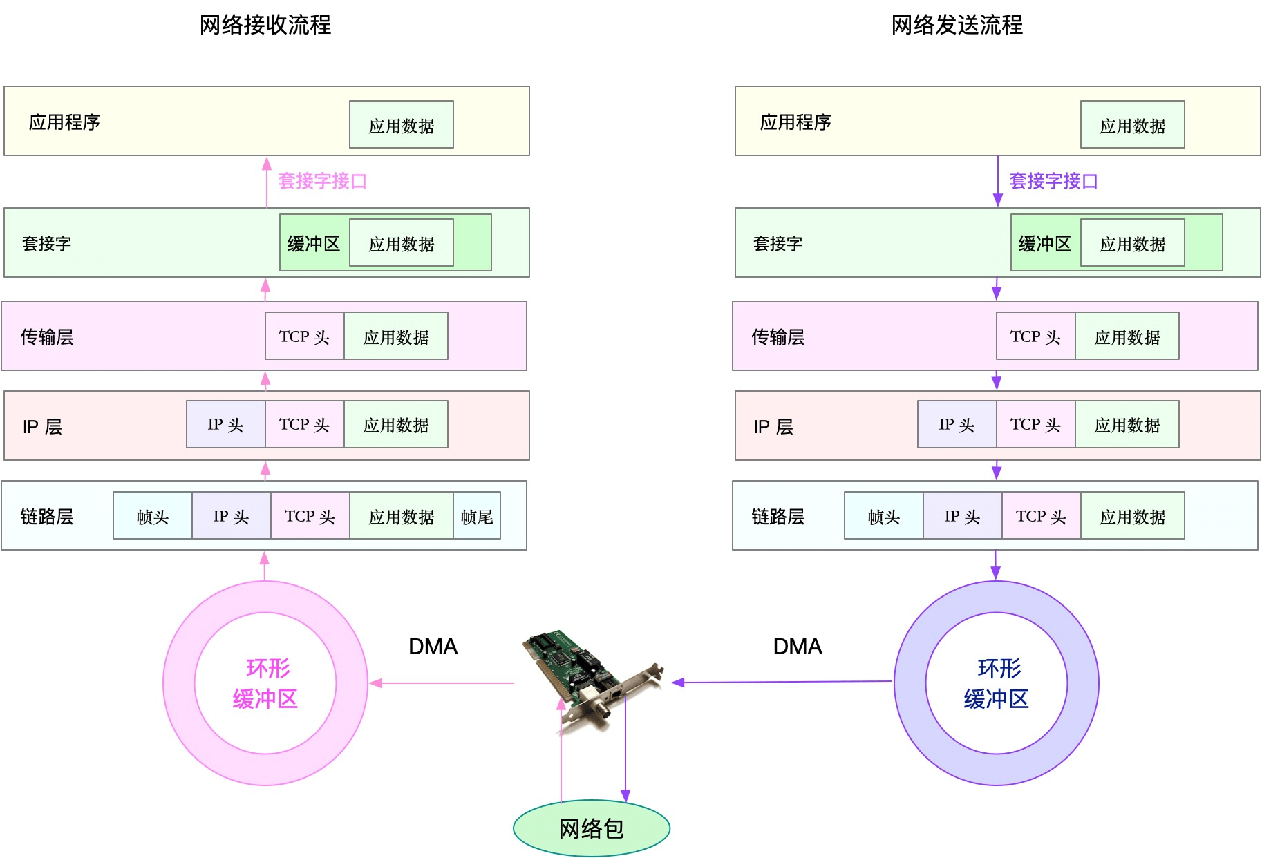 - 在链路层,可以从网络接口的吞吐量、丢包、错误以及软中断和网络功能卸载等角度分析;