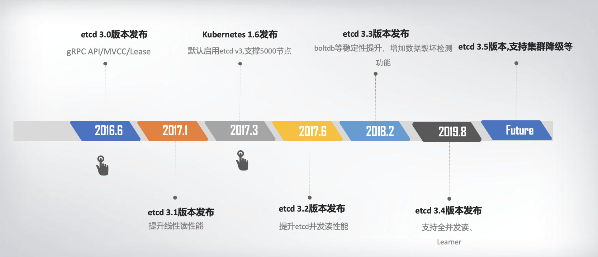 在2015年1月,CoreOS发布了etcd第一个稳定版本2.0,支持了quorum read,提供了严格的线性一致性读能力。7月,基于etcd 2.0的Kubernetes第一个生产环境可用版本v1.0.1发布了,Kubernetes开始了新的里程碑的发展。