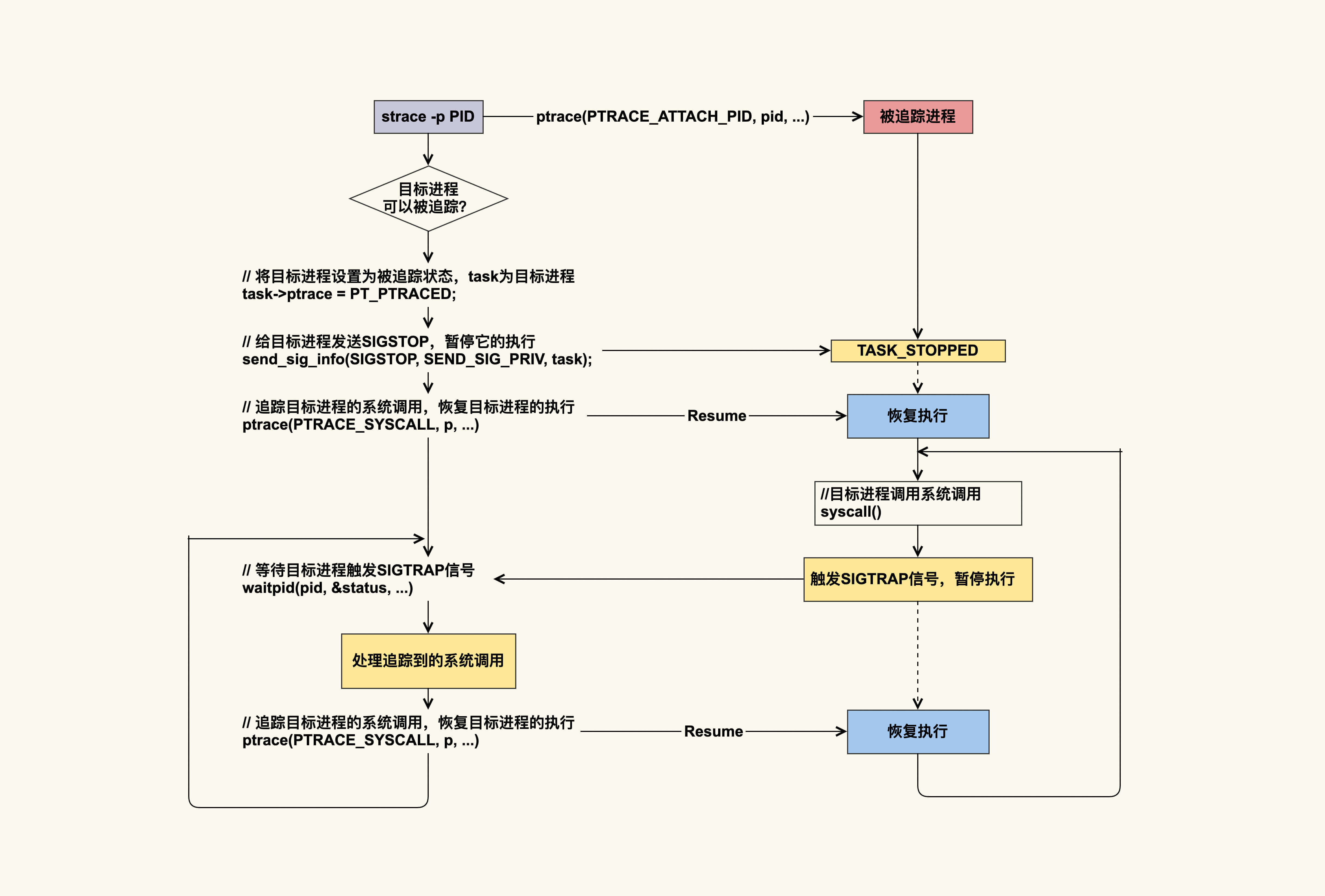 我们从图中可以看到,对于正在运行的进程而言,strace可以attach到目标进程上,这是通过ptrace这个系统调用实现的(gdb工具也是如此)。ptrace的PTRACE_SYSCALL会去追踪目标进程的系统调用;目标进程被追踪后,每次进入syscall,都会产生SIGTRAP信号并暂停执行;追踪者通过目标进程触发的SIGTRAP信号,就可以知道目标进程进入了系统调用,然后追踪者会去处理该系统调用,我们用strace命令观察到的信息输出就是该处理的结果;追踪者处理完该系统调用后,就会恢复目标进程的执行。被恢复的目标进程会一直执行下去,直到下一个系统调用。
