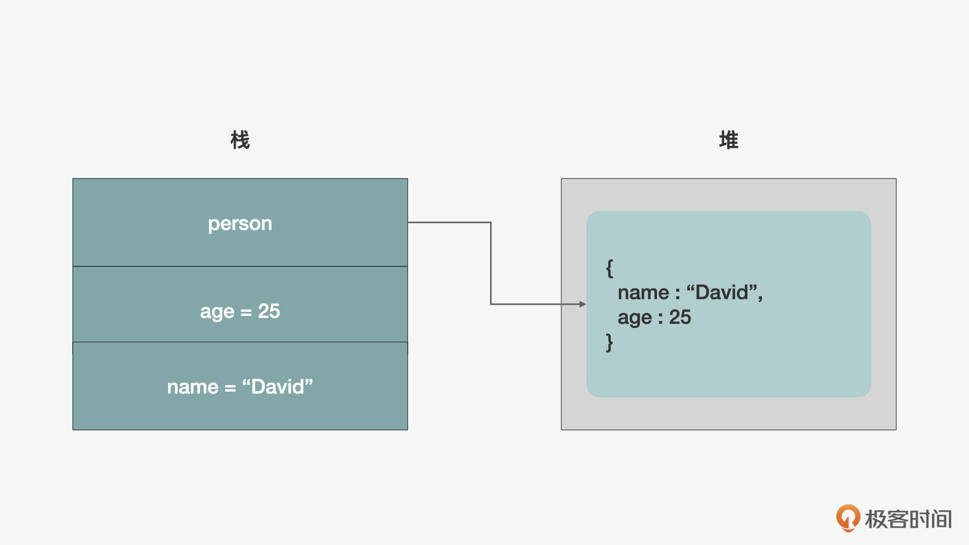 另外一点需要注意的是,对象数据在栈中只被引用,而实际存放在堆中。举个例子,假如我们有两个变量,变量personA赋值为{name: “John”, age:25},当我们将personB赋值为personA,然后修改personA的名称,那么personB的名字也会改。因为它们引用的都是堆中的同一个对象。