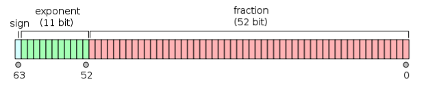 这种方式顾名思义,有64位比特。其中包含了1个比特的符号位(sign)、11个比特的有偏指数(exponent)、还有52个比特的小数部分(fraction)。