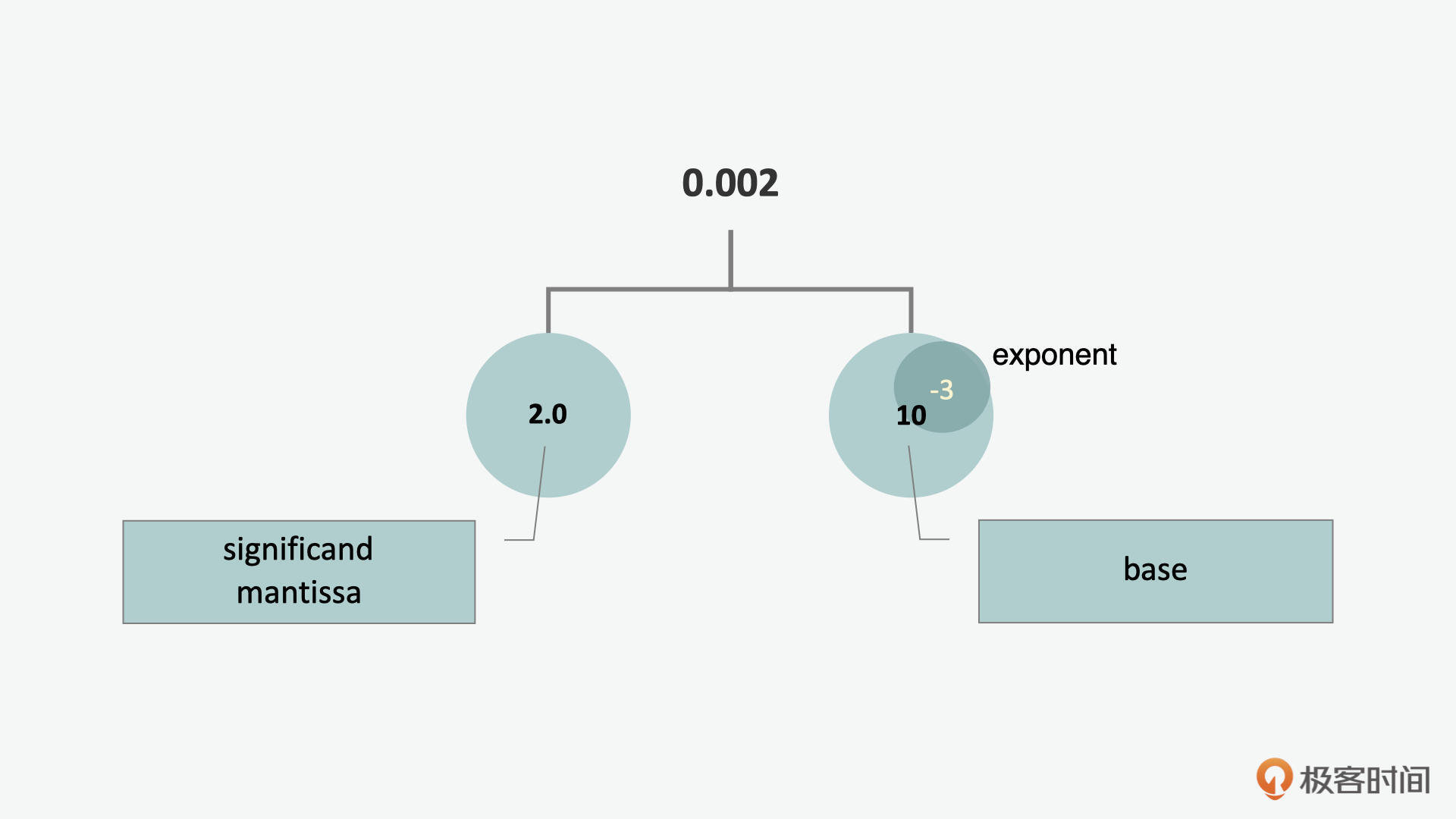 浮点数是采用科学计数法来表示的,由尾数(significand mantissa)、基数(base)和指数(exponent)三部分组成。上面的数字如果是用科学计数法表示,只需要写成$1.4 \times 10^{9}$即可。对于小数,就是反之,拿0.002举例,数字是2,那么小数就是10的负3次方。