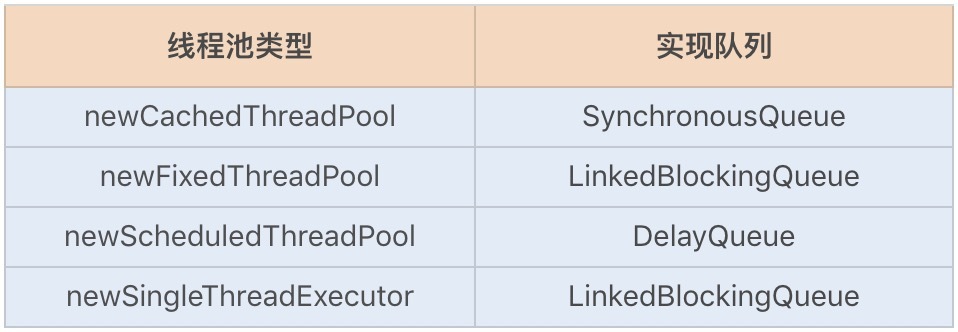Java线程池Executors还实现了以下四种类型的ThreadPoolExecutor,分别对应以上队列,详情如下: