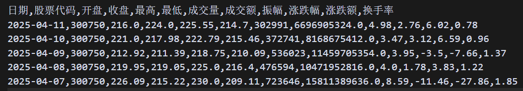 在清楚了理论之后,我们就以抓取宁德时代这只股票 2025 年 4 月 7 日到 11 日的日线数据为例,为大家演示一下代码。