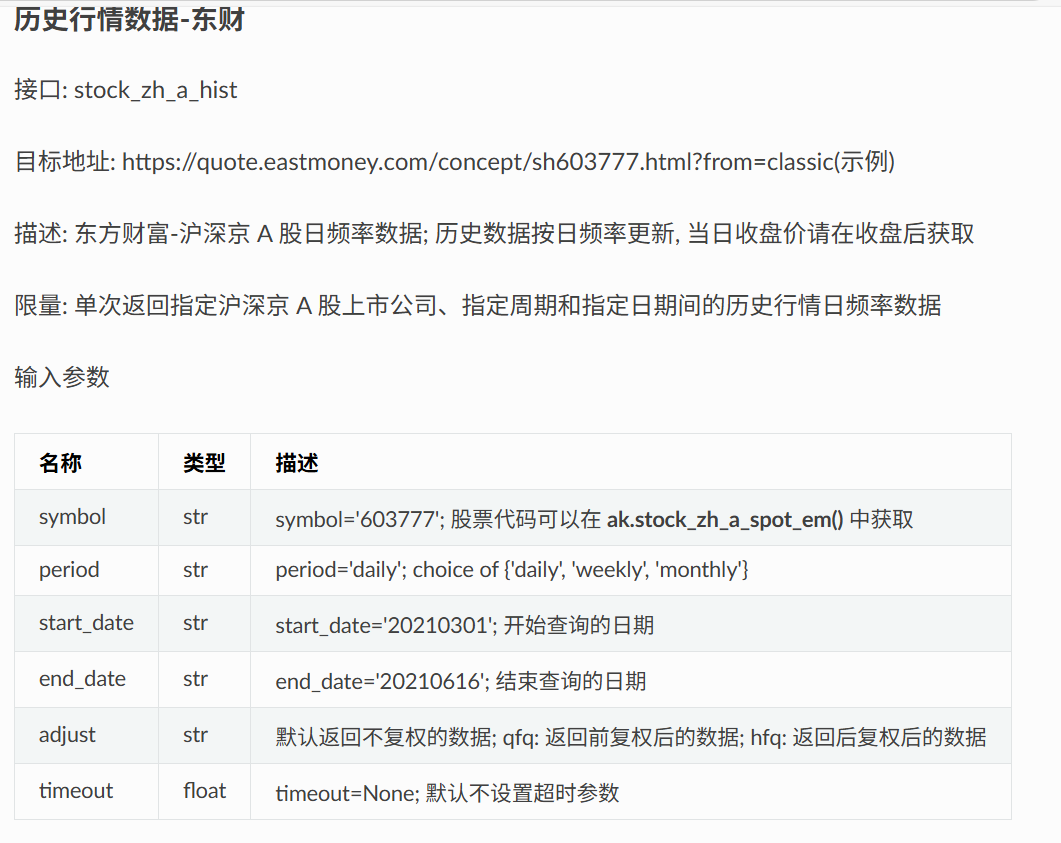 我们点击 AKShare 股票数据,就可以看到如下图所示的股票数据的抓取接口。这个接口是为使用纯 HTTP 请求方式的用户提供的,但由于我们使用的是 python 语言,因此可以直接调用 python 包中封装好的方法。