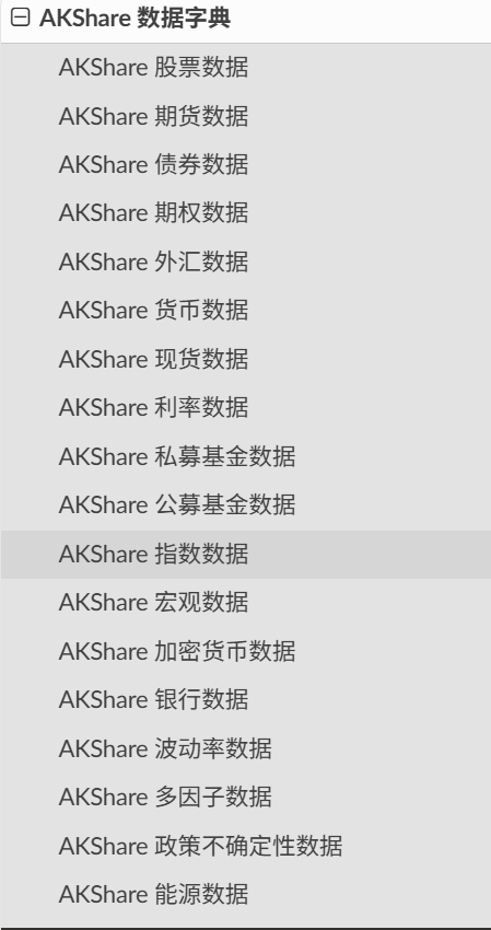 安装完成后,再看数据字典文档,可以看到 AKShare 支持多种类型的金融数据的抓取。
